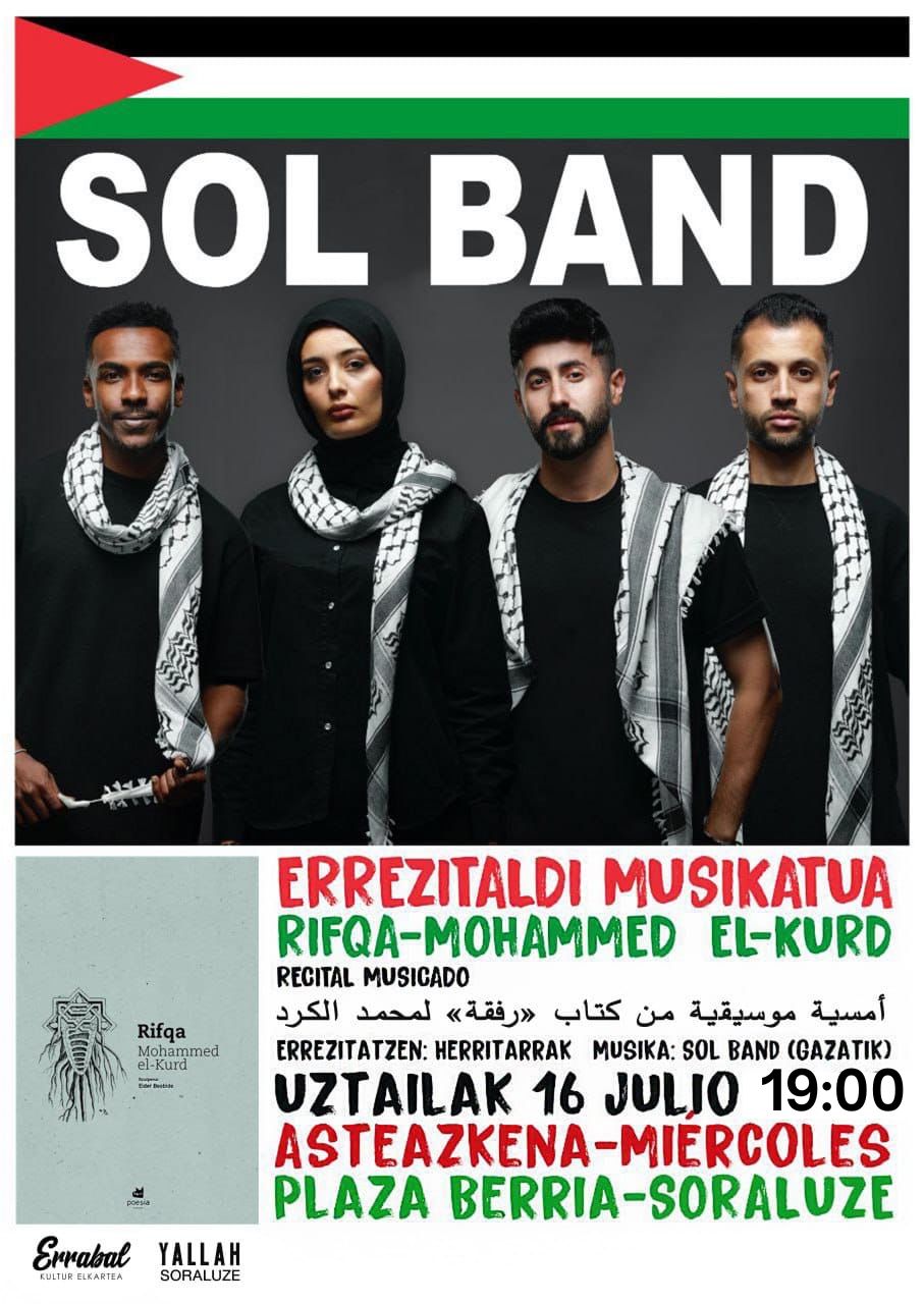 - Organizado por Errabal kultur taldea y Yallah Soraluze, se recitarán los poemas del libro "Rifqa" del poeta palestino Mohammed el-Kurd con la música del grupo gazatí Sol Band.