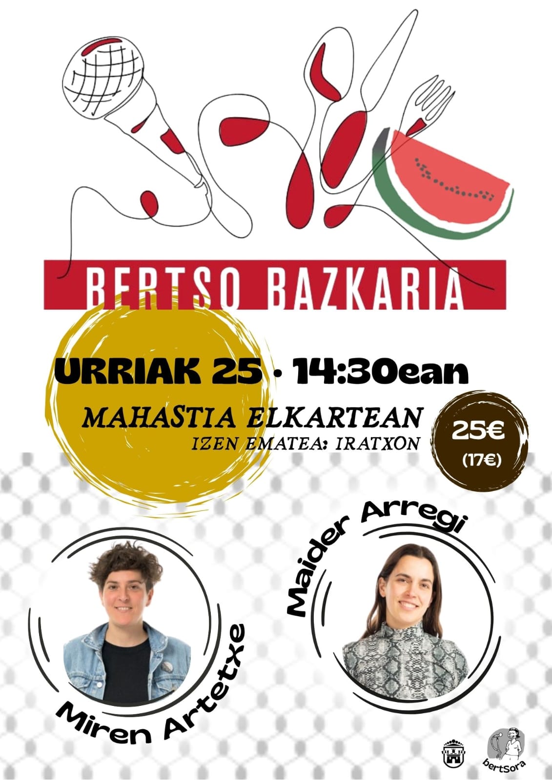 - bertSora elkarteak antolatuta, bertso-bazkaria egingo da Miren Artetxe eta Maider Arregi bertsolariekin.