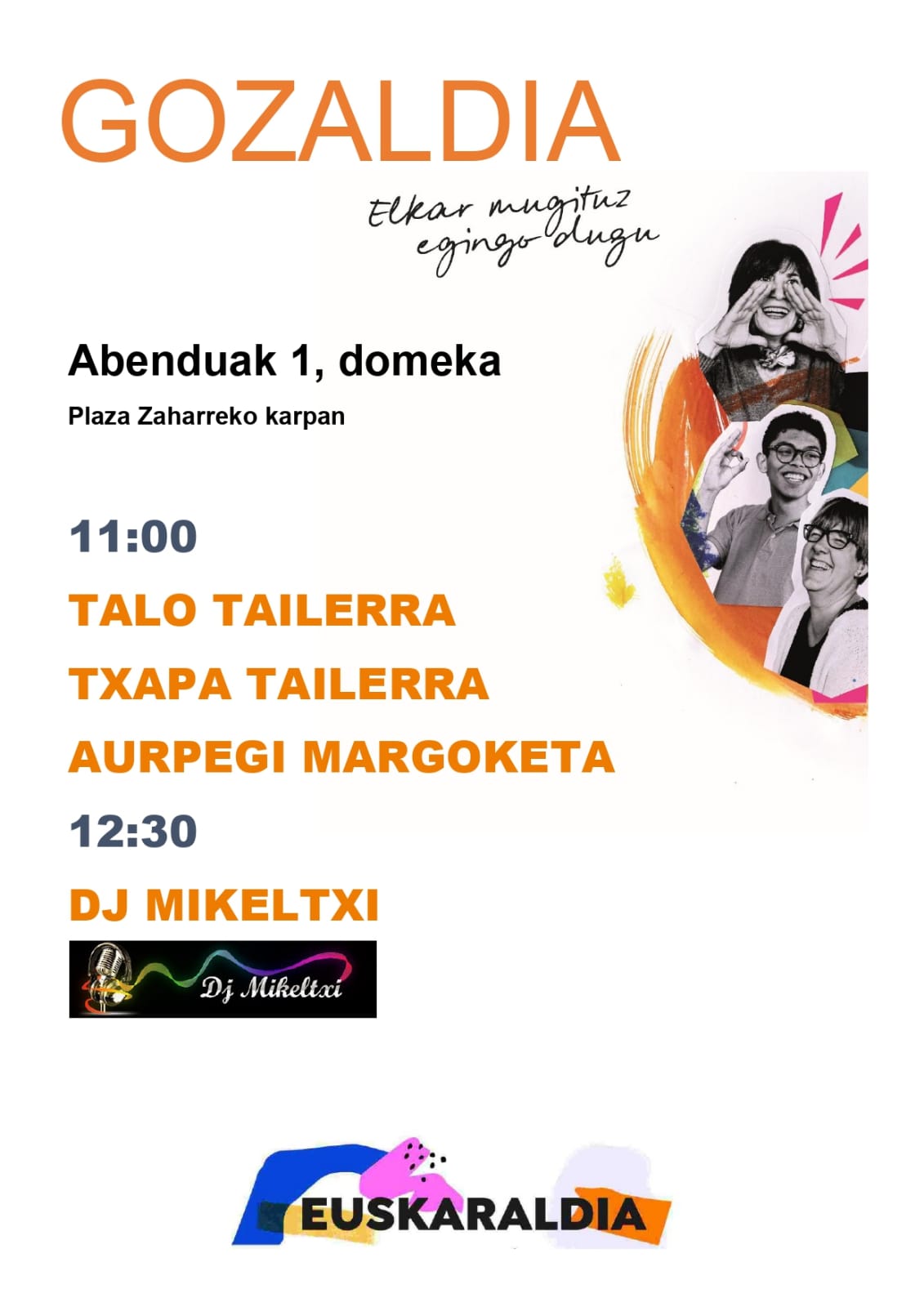 Aurpegi margoketa, txapa tailerra eta talo tailerra izango dira haurrentzako. Ondoren, DJ Mikeltxik giroa alaituko du.