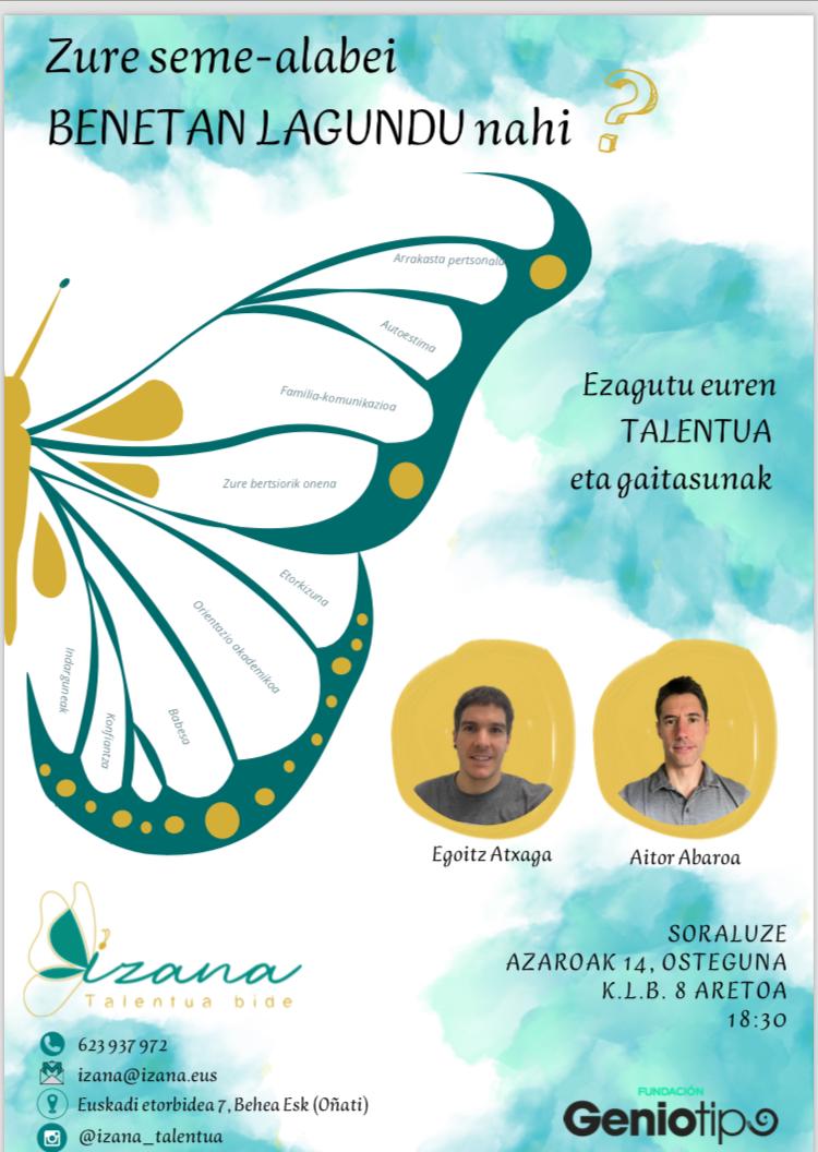 Oñatiko Izana enpresako Egoitz Atxaga eta Aitor Abaroak pertsona baten "talentua eta gaitasunak" identifikatzeko metodologia aurkeztuko dute. Hitzaldia, batez ere, zuzenduta dago nerabeen gurasoei baina edozein herritarrentzako da. Hitzaldia FELI OREGI ZENTROAK antolatzen du.