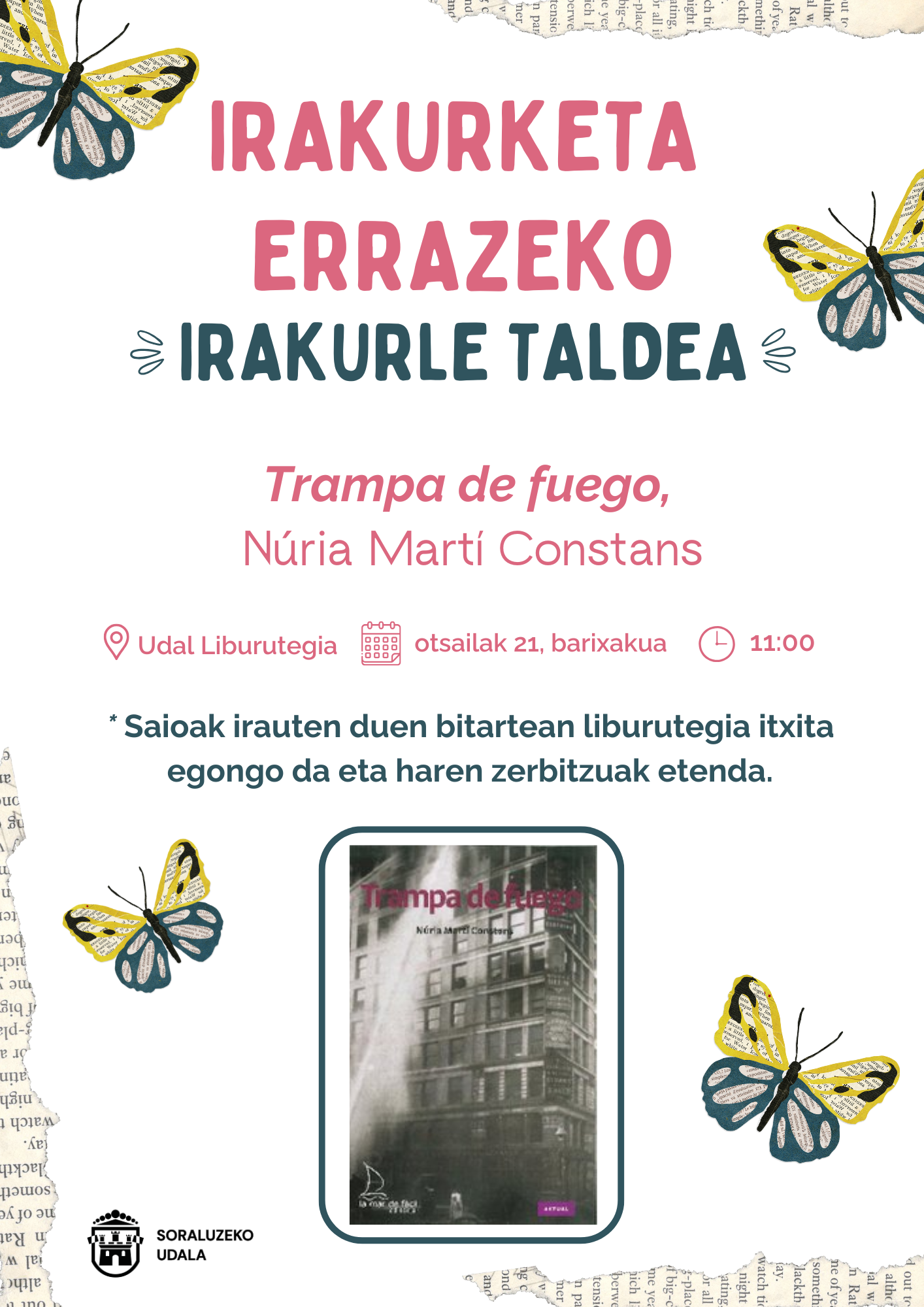 Irakurketa errazeko irakurle taldeko kideak udal liburutegian elkartuko dira Núria Martí Constans idazlearen Trampa de fuego eleberriaren azken kapituluak irakurri eta horri buruzko tertulia egiteko.