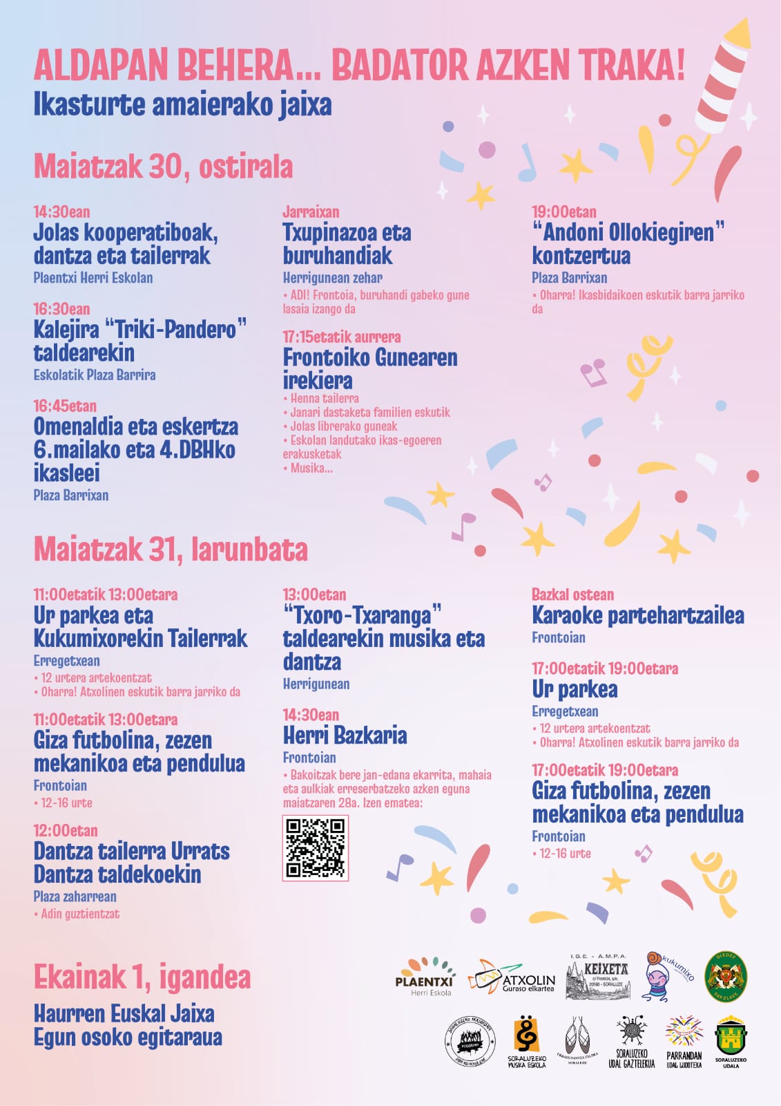 - "Aldapan behera... badator azken traka!" ikasturte amaierako jaia antolatu dute elkarlanean Soraluzeko hainbat hezkuntza eragilek maiatzaren 30 eta 31rako.