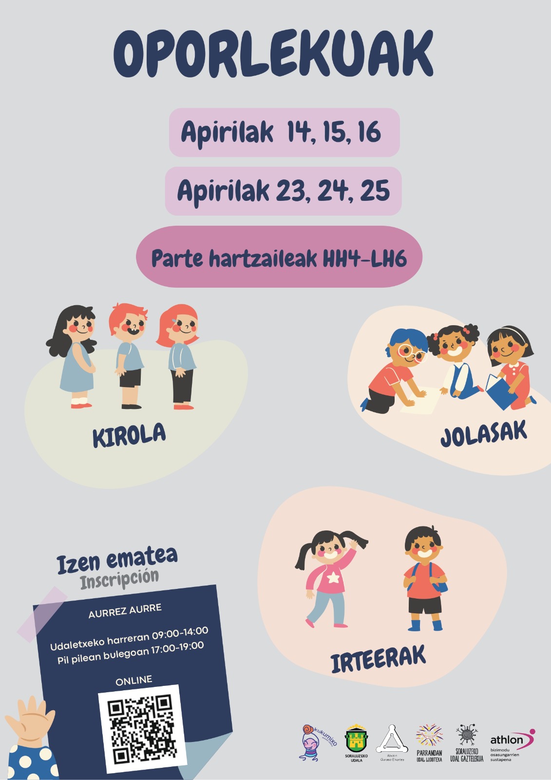 - 4-12 urte bitarteko umeentzat, bi astetan zehar banatuta, hainbat egunetako ekintzak antolatuko dira “Oporlekuen” barruan. 12-16 urte bitarteko gaztetxoek berriz, Gazteleku zerbitzuaren bidez irteera eta barne ekintza bereziak izango dituzte.